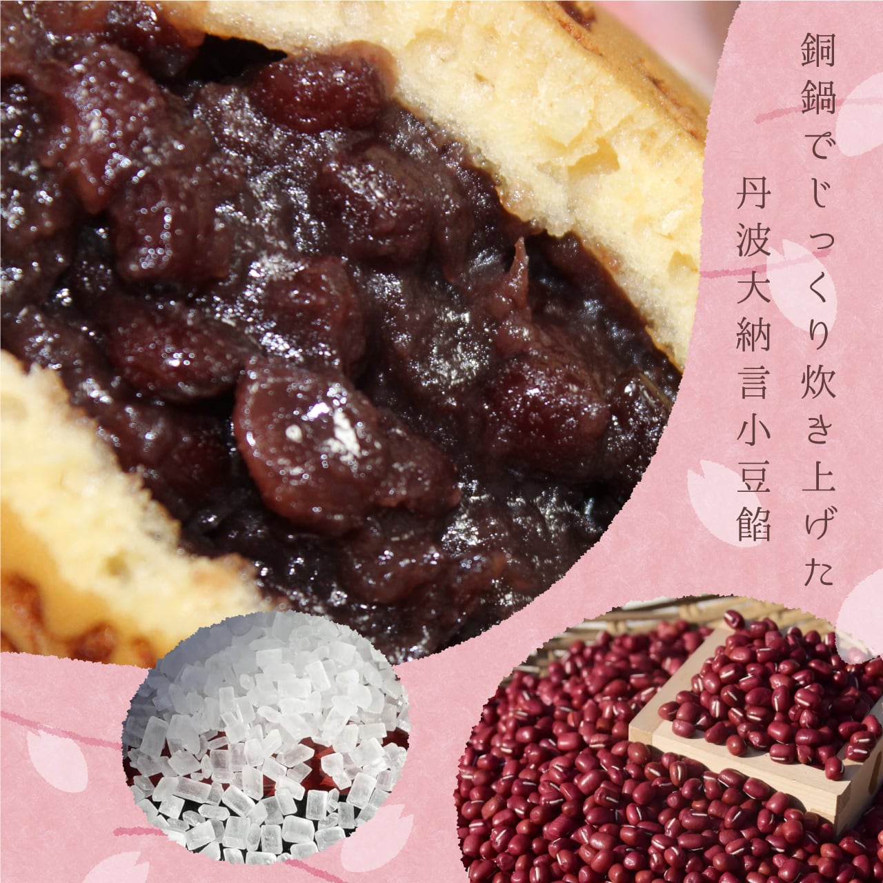 砂糖は、クセのない上品な甘さで、素材本来の味を引き立てる白双糖を使用。甘さが後に残らず、「甘すぎるのは苦手」という方にも、小豆本来の風味や美味しさをお楽しみいただけます。丹波大納言小豆のおいしさを味わえる「粒餡」に仕上げております。