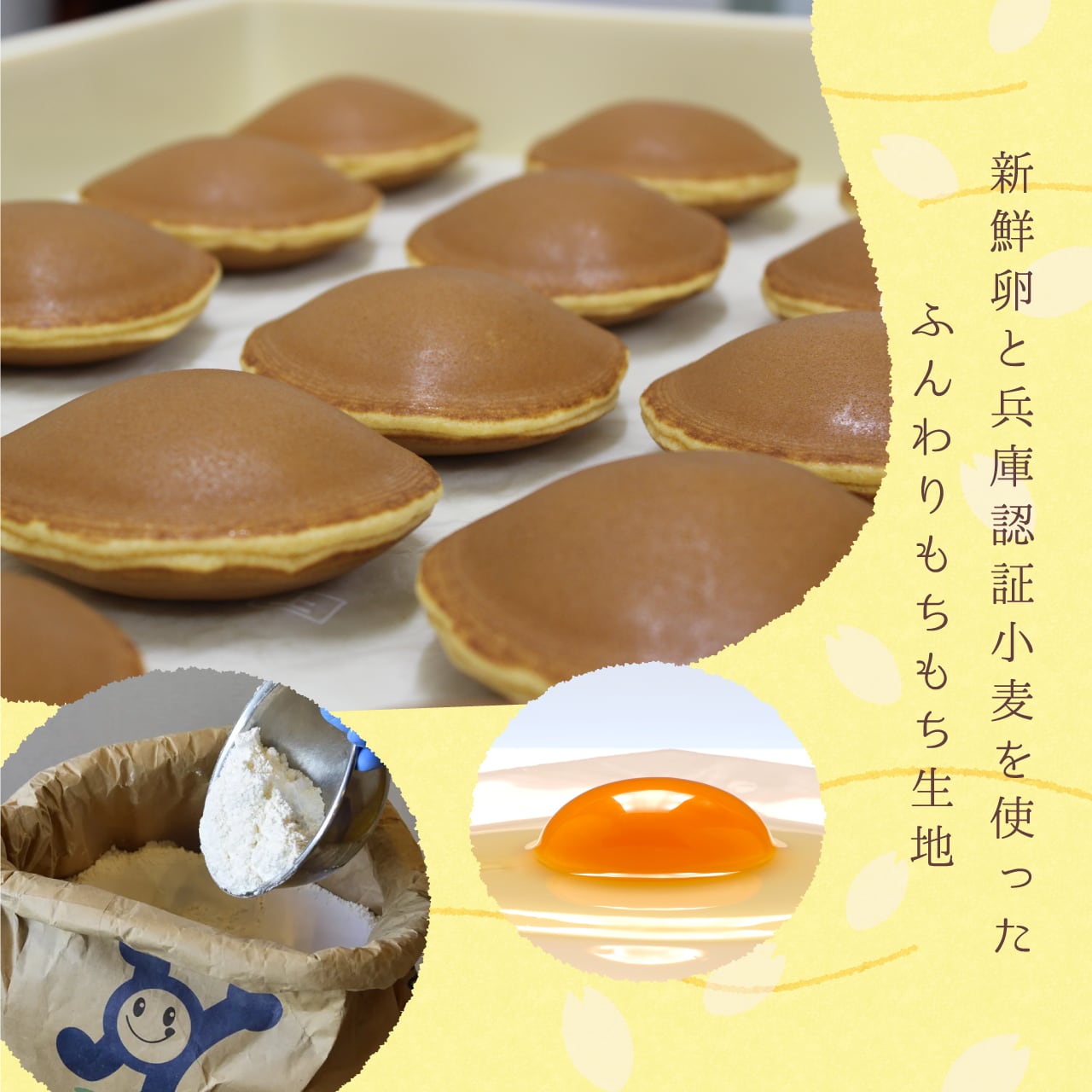 丹波市春日町・村上養鶏場の黄身の色が濃く旨みのある卵を一つずつ丁寧に割卵して使用しています。新鮮な卵と、兵庫県認証ブランドの小麦粉で仕立てた生地を銅板で焼き上げることで、卵本来のコクと自然な甘みが引き立ちます。ふんわりでありながら、しっとりもっちりとした食感に仕上げました。